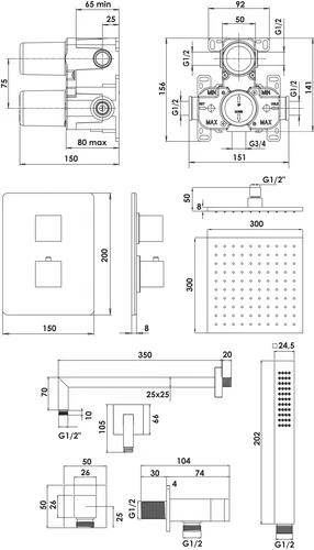 - Pomme de tête carrée monojet anticalcaire 300x300mm noir mat.