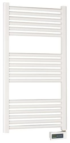 - Radiateur sèche-serviettes en acier à thermostat digital avec verrouillage parental, mode jour et horaires de déclenchement.