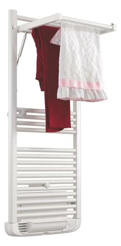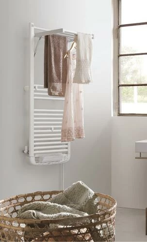 - Radiateur sèche-serviettes en acier multifonctions : Partie haute chauffante escamotable pour mise en mode étendoir ou étagère.