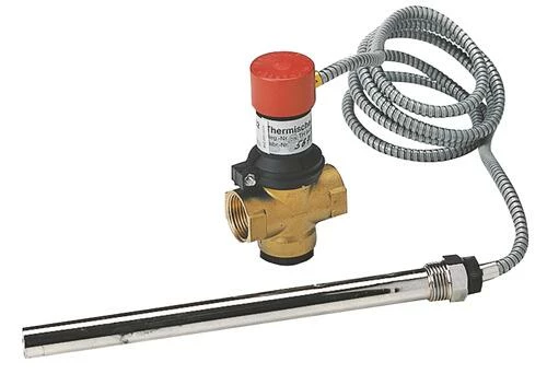 - La sonde montée sur la chaudière commande, en cas de montée excessive de la température (95°C), une soupape de décharge, provoquant l’admission d’une quantité équivalente d’eau froide
